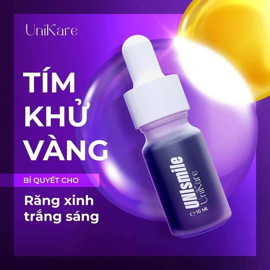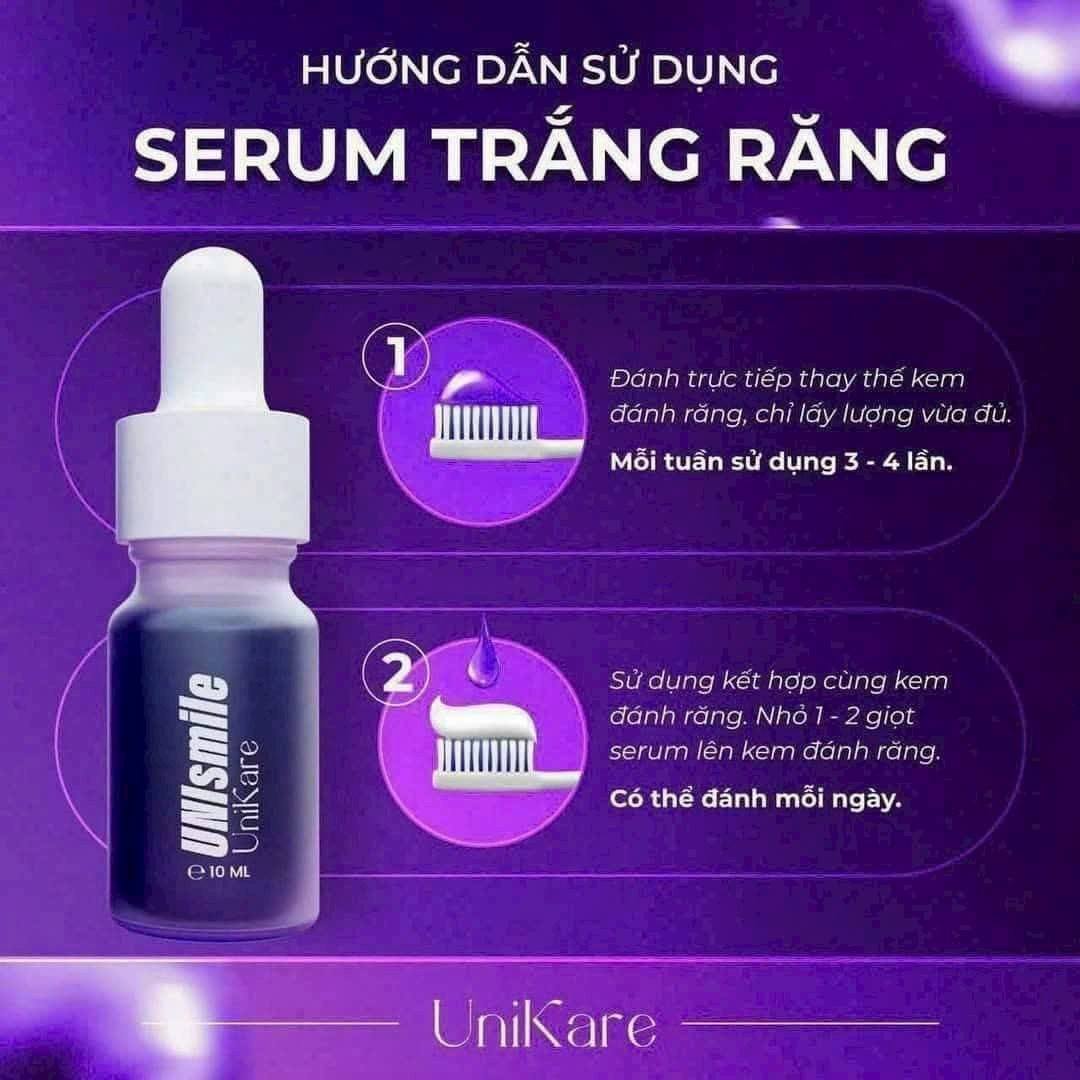 Serum trắng răng Unismile (thương hiệu Unikare, Việt Nam) là sản phẩm chăm sóc răng miệng dạng lỏng, được thiết kế để cải thiện độ sáng của răng thông qua cơ chế trung hòa sắc tố và làm sạch mảng bám.
