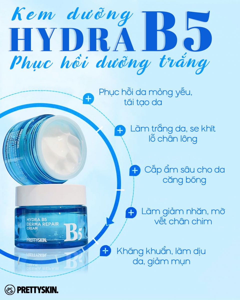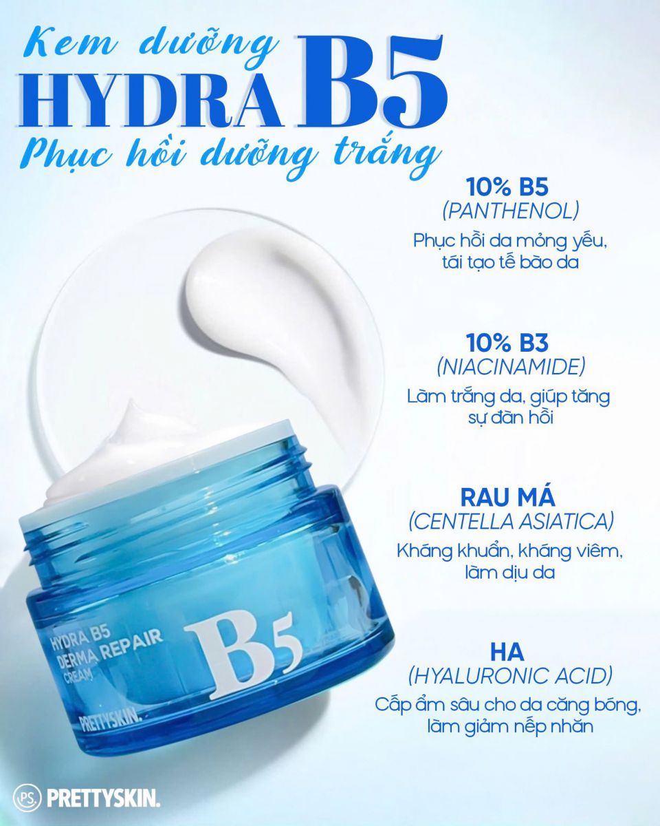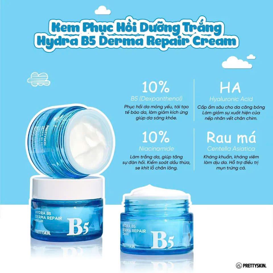 Kem Dưỡng Hydra B5 Derma Repair Cream của thương hiệu Prettyskin (Hàn Quốc) là sản phẩm phục hồi da đa năng, nổi bật với sự kết hợp của Vitamin B5 và Niacinamide, có kết cấu mỏng nhẹ, thẩm thấu nhanh, mang lại làn da mịn màng, khỏe mạnh, lý tưởng cho da nhạy cảm, da khô và da tổn thương.