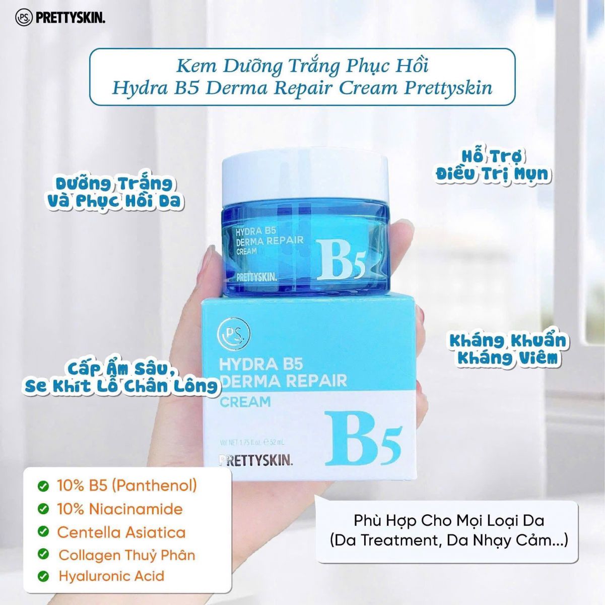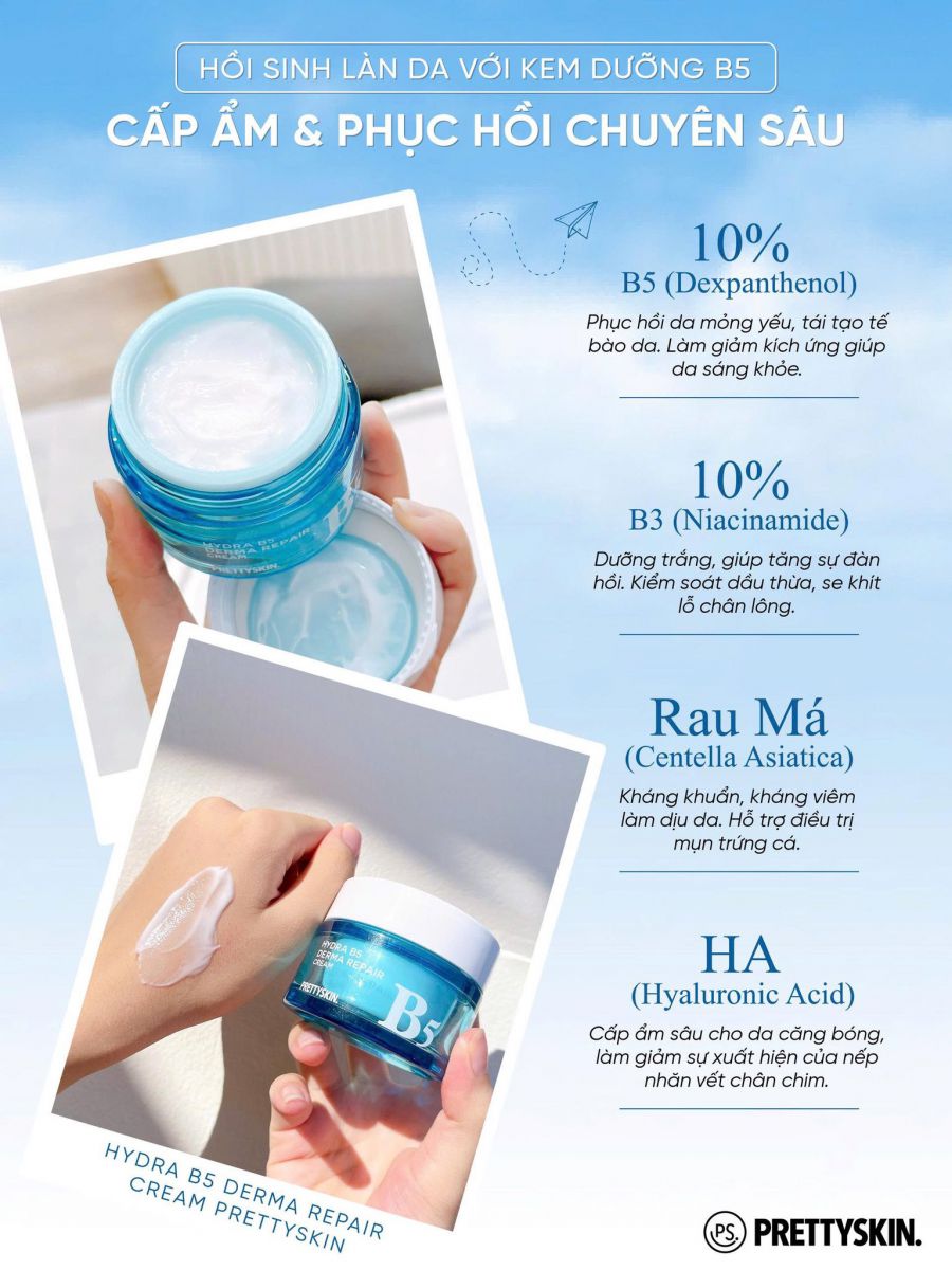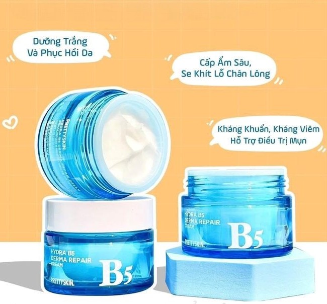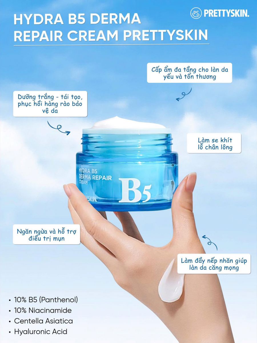 Kem Dưỡng Hydra B5 Derma Repair Cream của thương hiệu Prettyskin (Hàn Quốc) là sản phẩm phục hồi da đa năng, nổi bật với sự kết hợp của Vitamin B5 và Niacinamide, có kết cấu mỏng nhẹ, thẩm thấu nhanh, mang lại làn da mịn màng, khỏe mạnh, lý tưởng cho da nhạy cảm, da khô và da tổn thương.