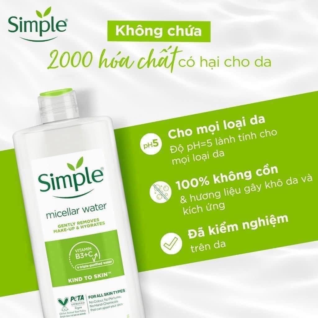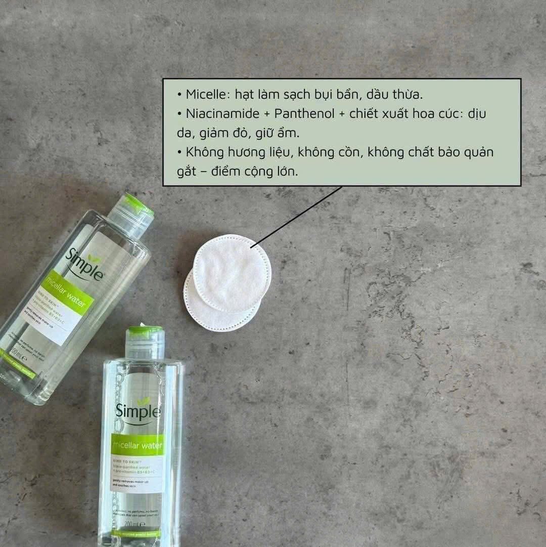 Độ lành tính cực cao: Đây là điểm mạnh nhất của nước tẩy trang Simple. Với tiêu chuẩn "5 không" (không cồn, không hương liệu, không chất tạo màu, không dầu khoáng, không hóa chất gắt), nó gần như không gây kích ứng, ngay cả với làn da nhạy cảm nhất hay da đang bị tổn thương.