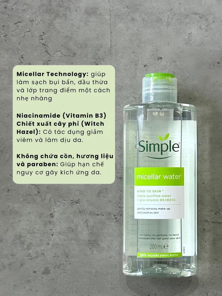 Các dòng nước tẩy trang của Simple sử dụng công nghệ Micellar. Các hạt mixen này hoạt động như nam châm, hút sạch bụi bẩn mà không làm mất độ ẩm tự nhiên.