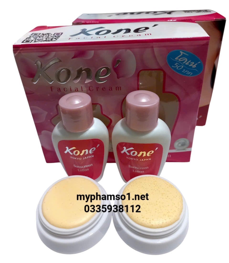 Kem Kone Thái Lan là sản phẩm chất lượng bán chạy trên thị trường, do đó thương hiệu Kone bị sao chép để gán cho rất nhiều sản phẩm. Chúng tôi muốn thông báo với quý khách hàng rằng thương hiệu Kone chỉ có 1 sản phẩm duy nhất là kem Kone Facial Cream (gồm 1 lọ nước hoa hồng và 1 hộp kem). Kone KHÔNG có sản phẩm sữa rửa mặt, kem body, serum hay kem ngày kem đêm. Quý khách hàng lưu ý tránh mua phải hàng giả.